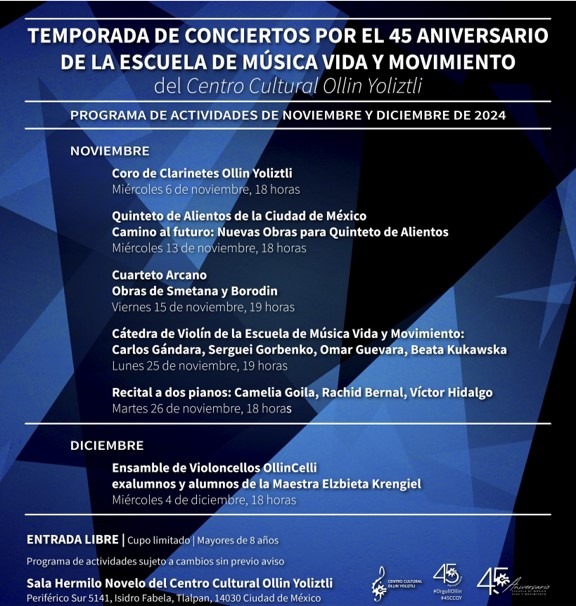 En el marco de la Temporada de Conciertos por el 45 aniversario de la Escuela de Música Vida y Movimiento del Centro Cultural Ollin Yoliztli, escuela y sede perteneciente a la Secretaría de Cultura de la Ciudad de México, la Orquesta Sinfónica Juvenil del recinto cultural ofrecerá una serie de conciertos durante el mes de noviembre en la Sala Hermilo Novelo del Centro Cultural Ollin Yoliztli.