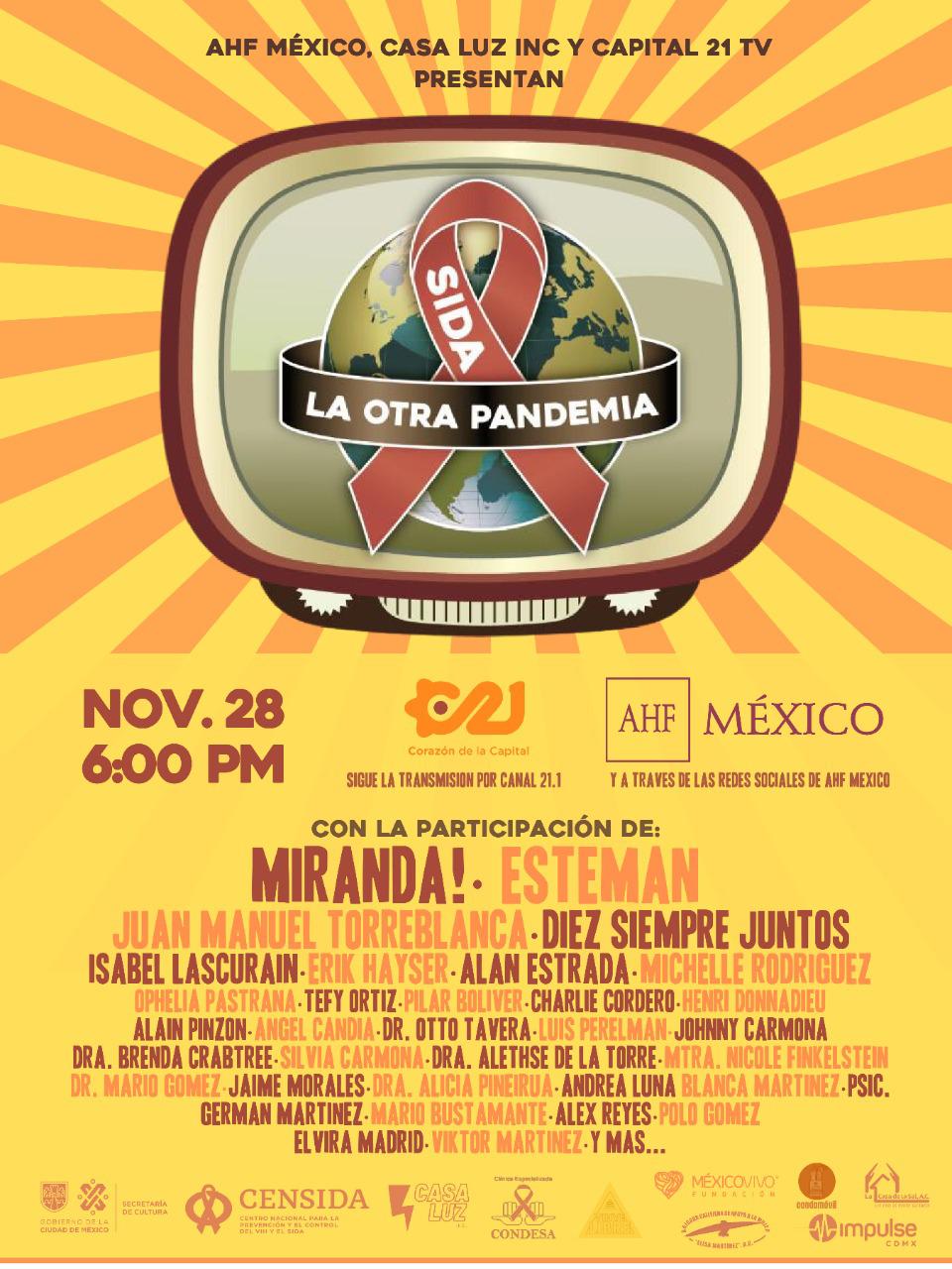 El especial “Sida, la otra pandemia” se podrá disfrutar a partir de las 18 horas a través de Capital 21, en su canal 21.1, también en las redes de AHF México y la serie de aliados que se están sumando día a día, al momento son 15 “es nuestra propuesta que puede replicarse en la actual situación dentro de la contingencia por Covid, ya que solo necesitamos informar y respetar para acabar con el virus”. aseguró Nicole Finkelstein.