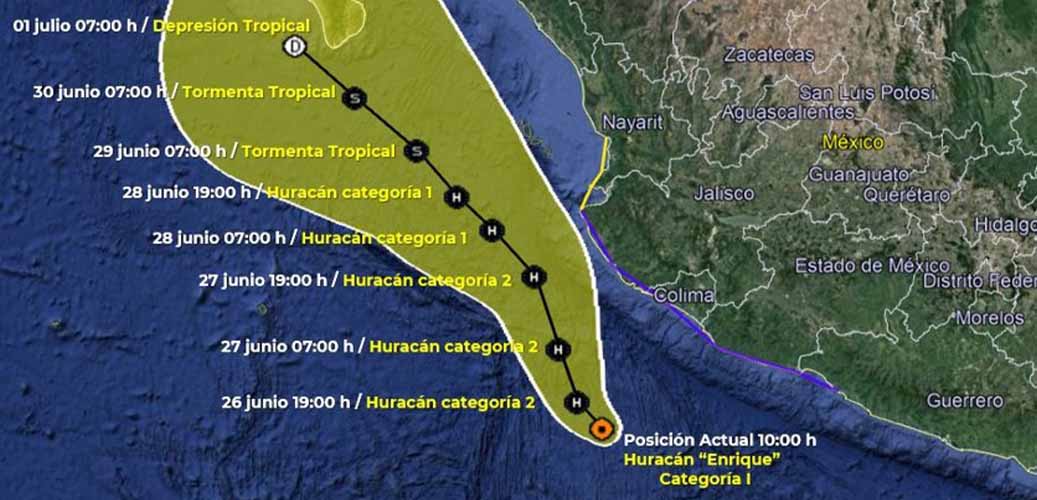 ⇒ Se prevé que en el transcurso de esta tarde “Enrique” se pueda intensificar a huracán categoría 2 en la escala Saffir-Simpson, aproximadamente a 225 km al suroeste de Manzanillo, Colima, y a 240 km al sur-suroeste de Playa Pérula, Jalisco.