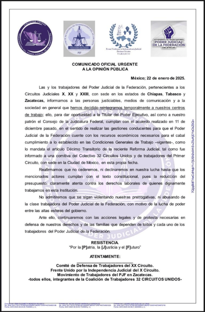 Los trabajadores del Poder Judicial Federal han decidido suspender su paro de labores tras alcanzar un acuerdo con la Ministra Presidenta de la Suprema Corte de Justicia de la Nación (SCJN), Norma Piña.