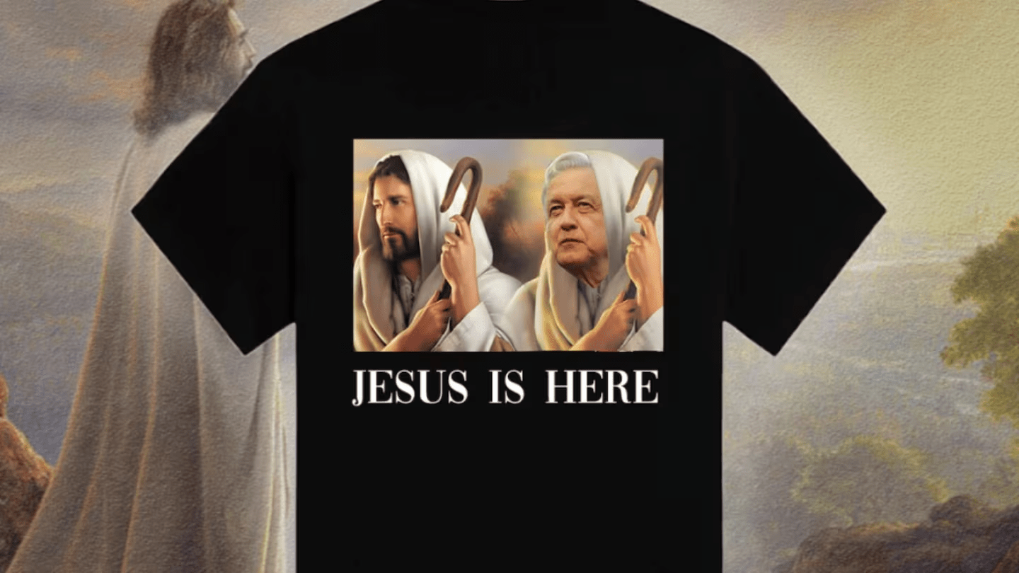 La nueva prenda, que ya se perfila como otro éxito de ventas, compara al presidente Andrés Manuel López Obrador con nada menos que Jesús. En el diseño, el icónico rostro del líder mexicano sustituye al del Mesías, mientras que ambos están representados con una túnica blanca y un bastón.