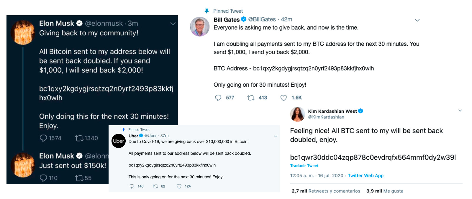 También empresas como Uber y Apple se vieron afectadas por mensajes publicados desde sus cuentas. Estos prometían doblar pagos a quienes hicieran transferencias en la mencionada criptomoneda a la dirección indicada.