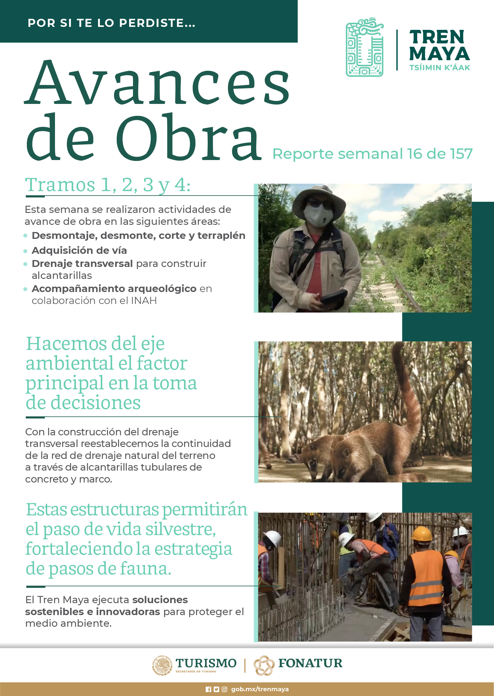 CDMX.-El Fondo Nacional de Fomento al Turismo (Fonatur) obtuvo la autorización de impacto ambiental para los tramos 1, 2 y 3, que irán de Palenque a Izamal en la construcción del Tren Maya, donde la Secretaría de Medio Ambiente y Recursos Naturales (Semarnat) dará vigilancia permanente al proyecto con sus estrictas medidas de mitigación.