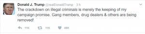 “La campaña contra criminales ilegales es meramente en mantenimiento de mi promesa de campaña. Miembros de bandas, traficantes de droga y otros están siendo deportados”, aseguró el mandatario en la red social de Twitter.