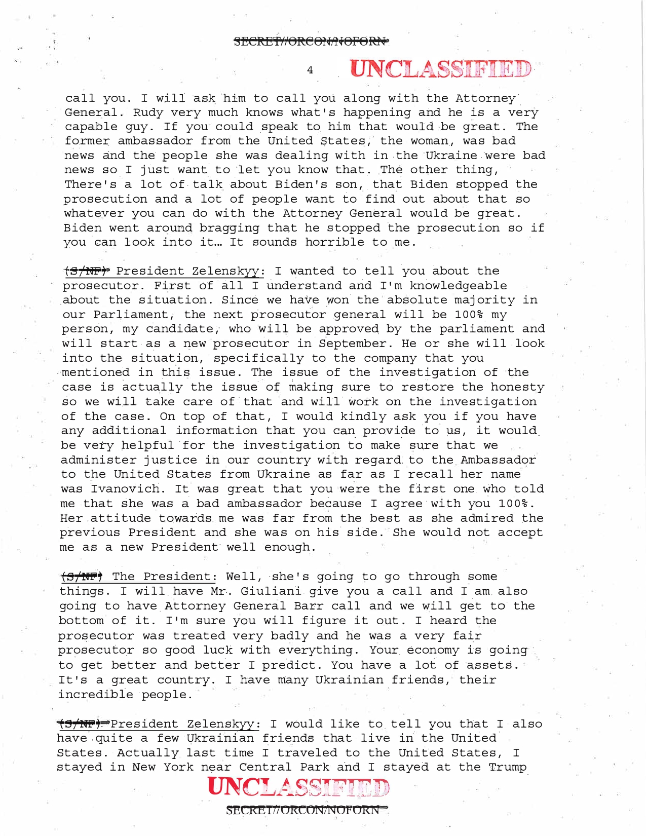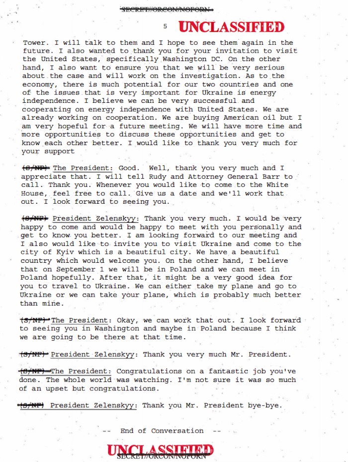 “Me gustaría que nos hiciese un favor porque nuestro país ha pasado por mucho y Ucrania sabe mucho de ello (…) Me gustaría que el fiscal general le llame a usted, a uno de su equipo y me gustaría llegar al fondo de ello”, agregó Trump, quien también señaló que Zelenski sería contactado por su abogado personal, Rudy Giuliani. Acto seguido, Trump remata: “Vuestra economía va a ir mejor de lo que yo predije”.