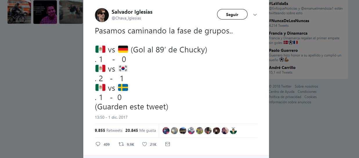 CIUDAD DE MÉXICO, 26 de junio (AlMomentoMX).— Una cuenta que supuestamente es de Salvador Iglesias  —protagonista de la serie Club de Cuervos que produce Netflix— aseguró en 2017 que México ganaría ante Alemania, Corea del Sur e incluso advirtió que el Tri se impondrá ante Suecia en el juego de este miércoles.