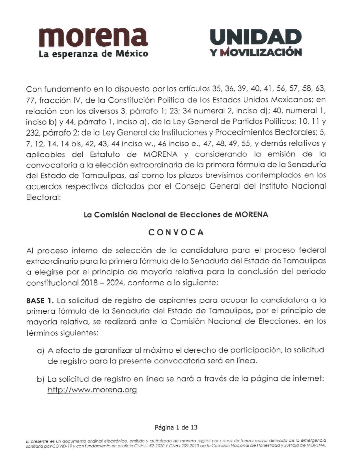 Tras el fallecimiento de Faustino López, Morena lanza convocatoria para elegir candidato a senaduría de Tamaulipas