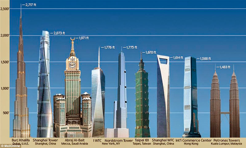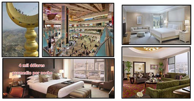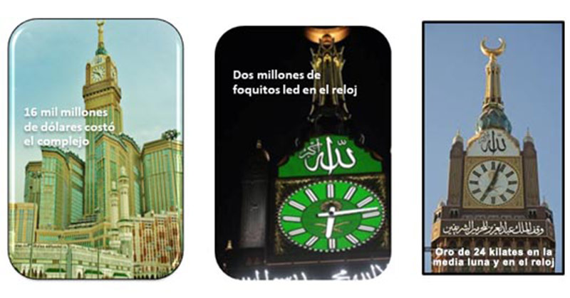 La fabricación de los engranes, carátula y maquinaría del reloj en Alemania, donde cada pieza pesa cientos de kilos, hasta sumar 35 toneladas, está en la larga lista de sorprendentes cosas de esta torre con su reloj. Claro, no falta el oro, sí oro de 24 quilates en 100 millones de pequeños mosaicos cubiertos de cristal pegados en las partes doradas del reloj y en la superficie de fibra de vidrio de la simbólica media luna de 23 metros de alto, en la cúspide de la torre sobre una aguja de 93 metros de alto, para darle la máxima elevación en los picos de la luna de 601 metros. Ahí dentro de la media luna se ubica un sitio especial de oración donde sólo elegidos entran y según sus creencias las oraciones en ese lugar tienen una importancia 100 mil veces mayor que en otro lugar. Por cierto, el reloj está a 450 metros de altura. En realidad cualquiera de los 10 principales millonarios del mundo podrían haber construido un complejo así, por tener un costo de 16 mil millones de dólares. Mexicanos, sólo uno, pero quizás el año que viene, otro alcance una suma así. Ahí suben y bajan potentados empresarios de todo el mundo en sus 96 elevadores, decenas de escaleras eléctricas y disfrutan de la plaza comercial más grande del planeta, de 5 pisos con lujos no para cualquier rico.