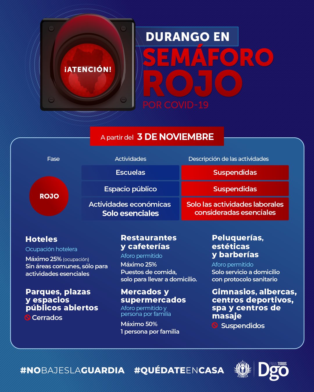 Por tanto, el gobierno de Durango extremará las medidas sanitarias para regresar al riesgo de contagio máximo por lo menos hasta el 17 de noviembre: