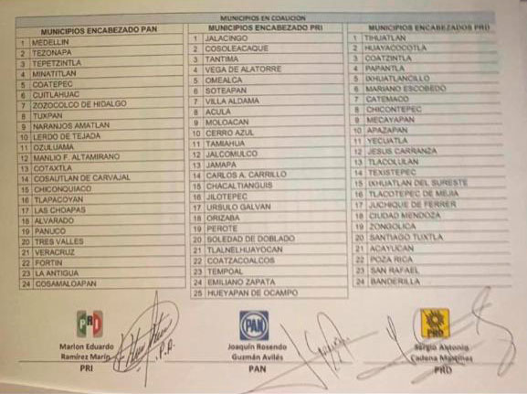 Así el Partido Acción Nacional (PAN) irá en 25 municipios como cabeza de la coalición: Medellín, Tezonapa, Tepetzintla, Minatitlán, Coatepec, Cuitláhuac, Zozocolco de Hidalgo, Tuxpan, Naranjos Amatlán, Lerdo de Tejada, Ozuluama, Manlio Fabio Altamirano, Cotaxtla, Cosautlán de Carvajal, Chiconquiaco, Tlapacoyan, La Choapas, Alvarado, Pánuco, Tres Valles, Veracruz, Fortín, La Antigua, Cosamaloapan.