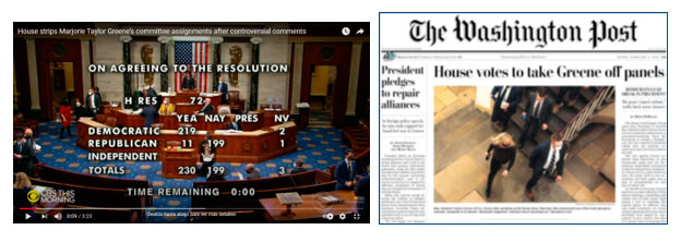 Pues por fortuna para los demócratas y para los niños, Taylor Greene sigue los pasos de su ídolo Trump a quien siempre apoyo sus teorías de conspiración: de verdadero ganador a irremediable perdedor: este 5 de febrero, todos los demócratas de la Cámara y 11 republicanos votaron para quitar a la congresista de Georgia, Marjorie Taylor Greene de sus asignaciones en el Comité de Educación.