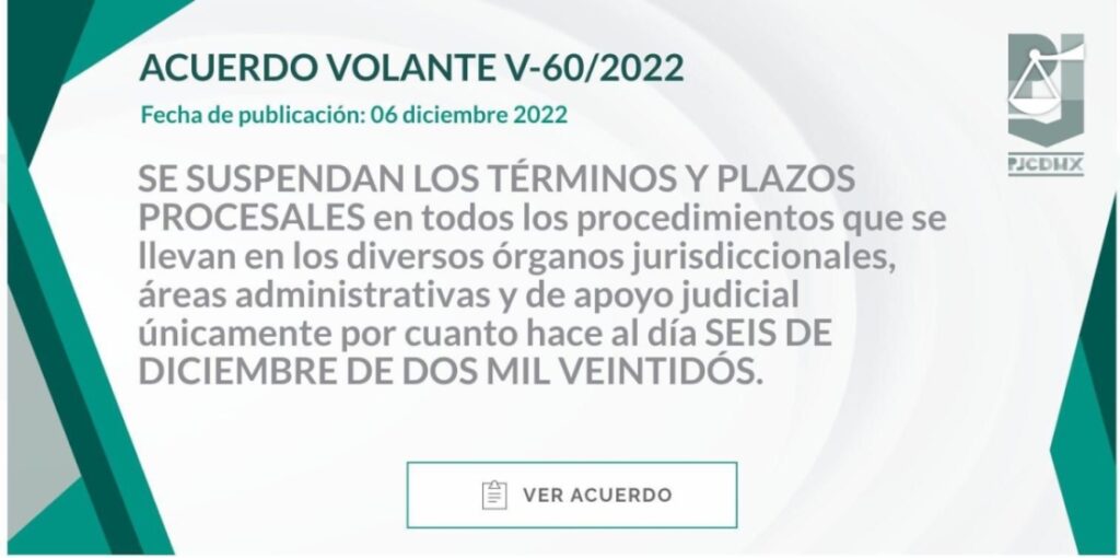 Cabe señalar que solo por el día de ayer miércoles 6 de diciembre, se suspenden los términos y plazos procesales en todos los procedimientos que se llevan en los diversos órganos jurisdiccionales, áreas administrativas y de apoyo judicial, dependientes del Poder Judicial de la CDMX.