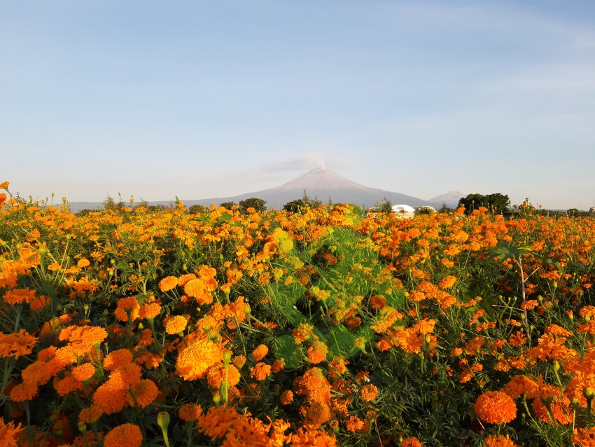 Los campos de cempasúchil de Puebla más famosos son los de San Jerónimo, Tecuanipan, Tepeaca, Quecholac, Coronango, Cuautlancingo, Palmar de Bravo, Huaquechula, Cholula y Atlixco. Cuando estés por llegar a alguno de ellos, detente en la carretera y admira la belleza de los cultivos con el amplio cielo azul de fondo. ¡Quedarás fascinado!