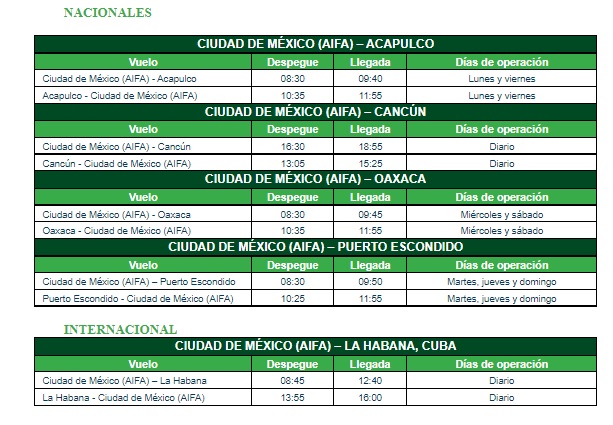 A través de un comunicado, la aerolínea detalló que los destinos hacia los cuales abrirá vuelos serán Acapulco, Cancún, Oaxaca, Puerto Vallarta y La Habana, los que se suman a Guadalajara y Monterrey, que opera desde el pasado 21 de marzo, día en que se inauguró el AIFA.