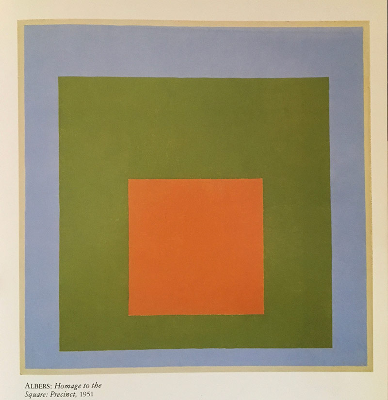 Me quedé perturbado al ver esas dos obras… ¡ah!, pero al pasar a la siguiente página, después del acercamiento de la obra de Pollock, entendí con claridad lo que quería decir Alain de Botton cuando aseguraba que hay obras que nos permiten “volver a equilibrarnos”, tal como me pasó en esa página cuando, de pronto, siento un descanso, un especie de equilibrio que me urgía encontrar en alguna parte, tal como lo encontré en el Homenaje al cuadrado: Precinct de Josef Albers (1951).