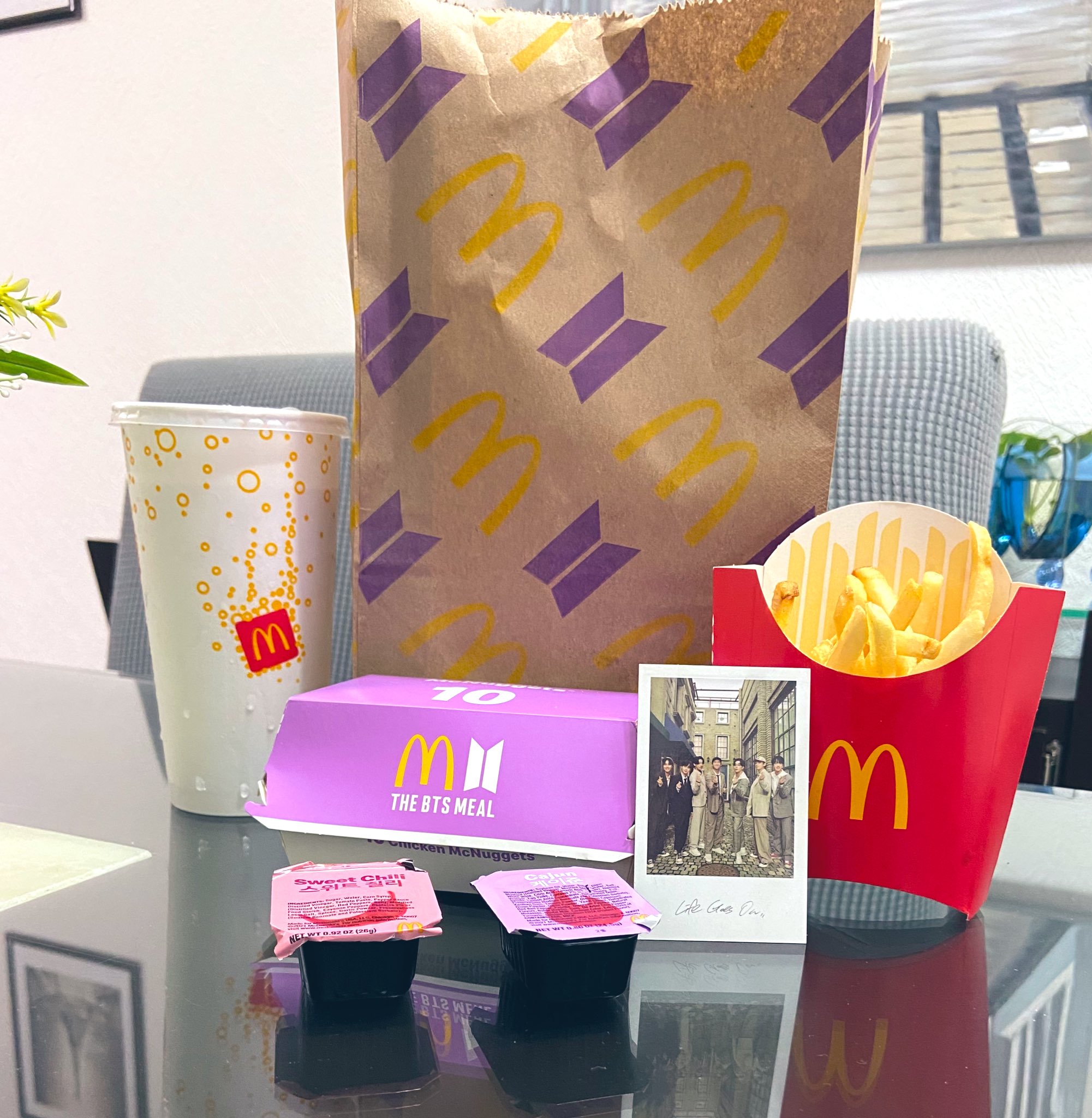 ⇒ Además, la caja de Nuggets, los vasos y las bolsas tienen el logo de BTS y el de la famosa cadena de comida rápida. También cuenta con colores púrpura, característicos de la banda surcoreana.